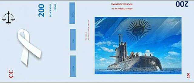 El billete tiene de un lado la imagen del submarino con los 44 marinos y un mapa de la República Argentina con el fondo de la bandera nacional. En el fondo se distingue una cinta blanca en señal de memoria y duelo. Del otro, otra foto del submarino con la leyenda “ARA San Juan, submarino desaparecido el 15/11/17”.