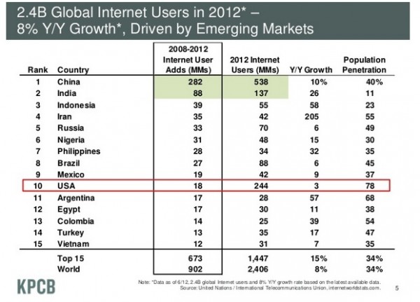 El reporte elaborado por Mary Meeker para Keliner Perkins fue presentado en Stanford y toma en cuenta todo tipo de conexiones a Internet para esta medición, que también presenta diversos reportes sobre el mundo tecnológico, tales como el uso de los dispositivos móviles y el comportamiento de uso de los usuarios con las tabletas y los teléfonos inteligentes.