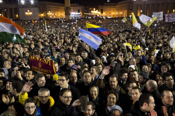 Miles de fieles congregados en la Plaza de San Pedro celebraron con júbilo la fumata, mientras las campanas de la basílica empezaban a repicar para festejar la noticia, tal y como manda la tradición. “Viva el Papa, viva el Papa”, fue el grito que estalló en los alrededores del Vaticano. Cuando se supo la identidad del Papa gritaron: “Francesco, Francesco“. No sólo es el primer papa argentino y latinoamericano sino también el primer jesuita.